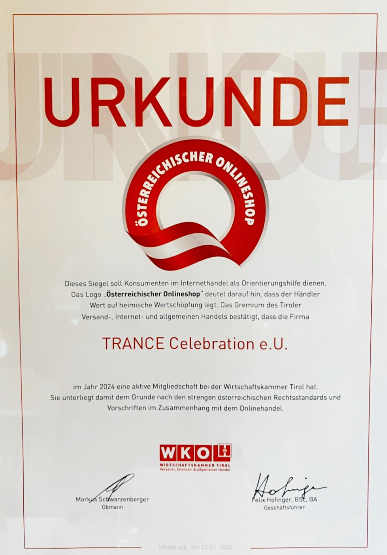 TRANCE Celebration e.U. besitzt ein eingetragenes Markenpatent beim Österreichischen Patentamt. Dieses Markenpatent schützt die Eigenmarke des Unternehmens, die unter anderem für individuell gestaltete Produkte wie Kleidung, Accessoires und Fanartikel verwendet wird. Die Marke ist zentraler Bestandteil des Online-Shops, der mit dem E-Shop-Gütesiegel des Landesgremiums der Wirtschaftskammer Tirol ausgezeichnet wurde.